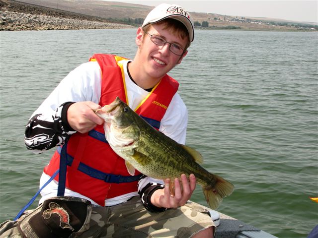 Christopher Start poses with the a nice largemouth that was caught just off the dam during the annual Cast for Kids event on Potholes Reservoir.