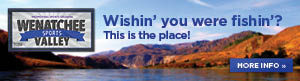 I heard that people have good luck catching cutthroat from the shore in Monument Bay on Lake Chelan, so I headed up there on Tuesday morning. When I crested the hill and could see the lake from the Navarre Coulee Road, there wasn’t a boat in sight. I expected so see at least a couple of boats trolling above the Yacht Club, but there wasn’t a boat on Lake Chelan anywhere. Can’t remember this sight, anytime of year on Chelan. Weird. I found a spot near the monument, put a Rooster Tail on my spinning rod and let fly. In the first 20 casts there were at least six cutthroat following my Rooster Tail or Little Cleo spoon back to the shore. They would come right to the bank and then veer off. On my third color of Rooster Tail—Wham. A nice cutthroat grabbed the lure and I hoisted it up onto the rocks at my feet. As soon as the tension left the line, the fish slipped off the barbless hook and flopped back into the lake! I guess my luck wasn’t so good, but this is something I want to go again. That cutthroat was at least 12 inches long and a beauty.