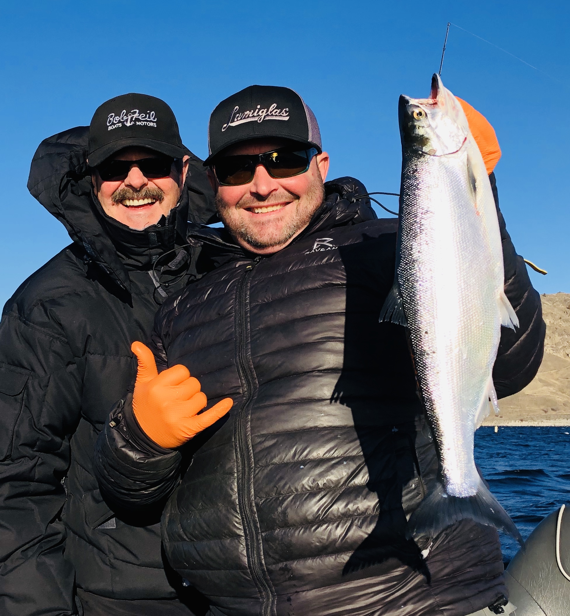 Austin Moser and I pose with a 19-inch kokanee caught in Dec. on Lake Roosevelt. A Kokabow Tackle Copper Series blade and Ravisher Spinner did the job.