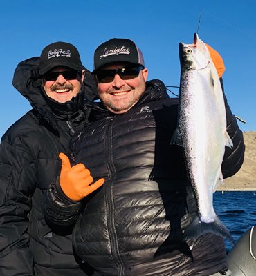 Austin Moser holds up a big kokanee that we got on our first trip on Lake Roosevelt last year. Fishing is much better this season.