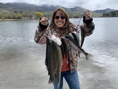 For FishingMagician.com, I'm Eric Granstrom. It's funny, I talk with a lot of fisherman who say they don't go on opening weekend because there's too many people. But if you think about it, we all HAD to fish opening weekend at some point in our lives to get hooked on this sport to begin with, right?! Marion had some friends who make their annual pilgrimage to Pearrygin Lake for the opening weekend and make it a reunion of sorts. They were staying at Silverline Resort and invited us to visit. After a doubleheader baseball game Saturday, we hooked up Dad's trailer and headed north. We arrived at my family's lot near Twin Lakes just before dark and ran up to see Mel and Lisa. They said the fishing was great and we should try it the next morning. After a good night's sleep, we grabbed the lawn chairs and threw some Power Bait off the beach at Silverline. I caught my limit of smaller plants and then Marion hooked into two monsters back-to-back. Each were 20-and-a-half inches and well over 2-pounds. You can see the video on our Facebook page today for more information. Until next time, Good Fishing!