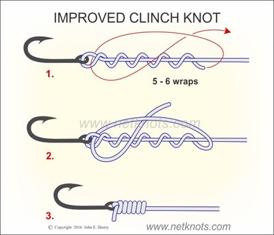 Here are the instructions for tying an improved clinch knot. It is the most important knot to learn, and can be used to tie on hooks and attach swivels.
