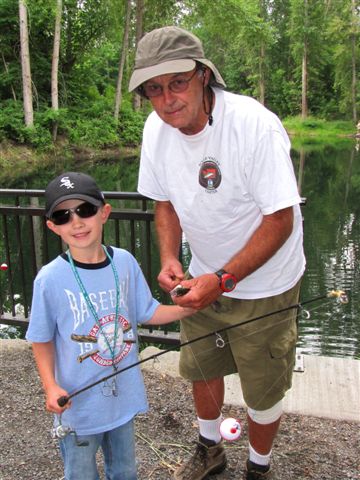 Bob Stroup, of the Icicle Valley Chapter of Trout Unlimited helps his grandson Brian with a fish caught at the TU Kids Fishing Derby at Blackbird Island.