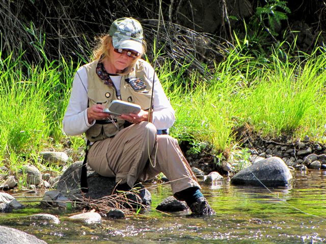 My wife Eileen is shown here selecting her next fly. She was casting to small rainbow on the San Poil River, and she caught a bunch!