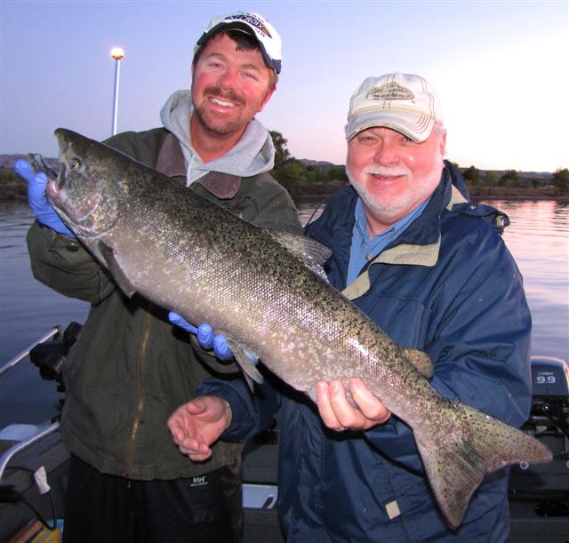 Greg Thomas (right) poses with Shane Magnuson, Upper Columbia Guide Services, with a huge king that he landed while fishing above Wells Dam.