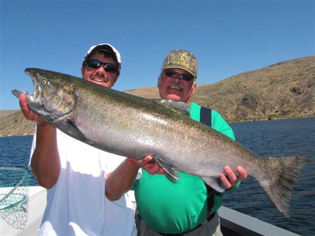 Rod Hartman (right) shows off one of the kings he caught while fishing with Shane Magnuson, Upper Columbia Guide Services, near Pelican Point.