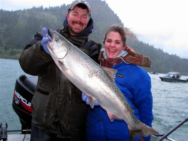 Shane Magnuson, Upper Columbia Guide Services helps his friend Amanda show off the spring salmon she caught while fishing with him at Drano Lake on the lower Columbia.