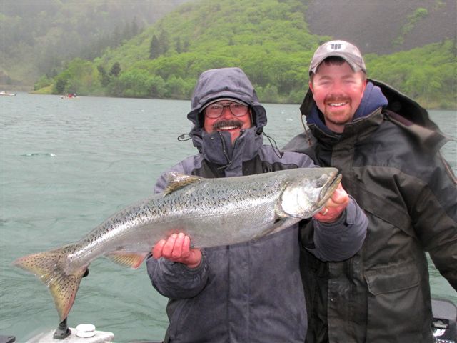 Shane Magnuson (right) Upper Columbia Guide Services poses with me and a bright spring salmon caught on a recent trip to Drano Lake.
