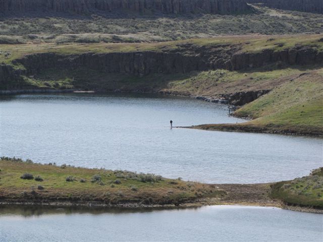 An angler is dwarfed by the high desert scenery at Sage Lake. Sage was one of the lakes that opened on April 1st. There were quite a few anglers camped on its shores.