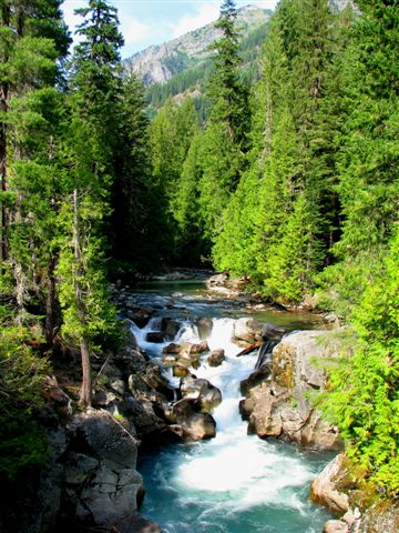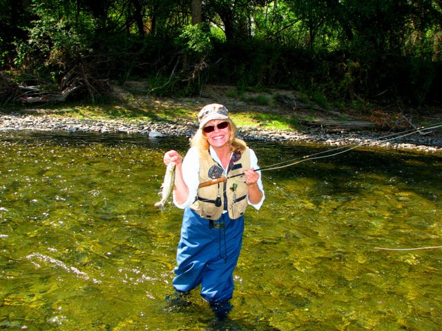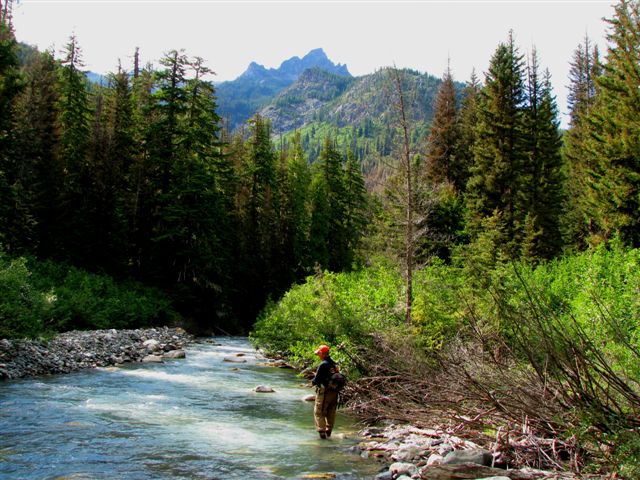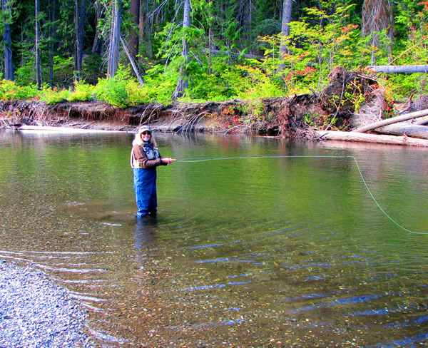 My wife Eileen is shown here breaking in a new fly rod (an anniversay present) on the Icicle River.