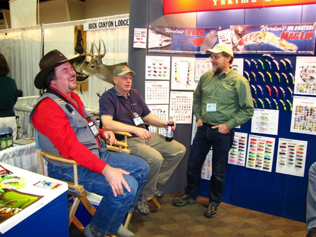 Buzz Ramsey, left, is getting a laugh out of the conversation taking place with Rob Phillips (center) and a visitor to the Yakima Bait booth at the Pasco show.