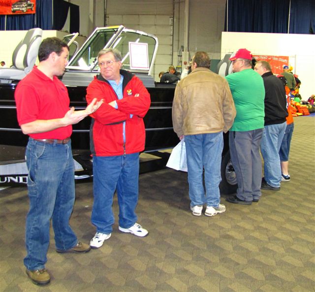 Dan Allen (left) of Valley Marine explains some of the features of a Lund boat to one of the many folks that stopped by to see the Valley Marine display in Pasco.