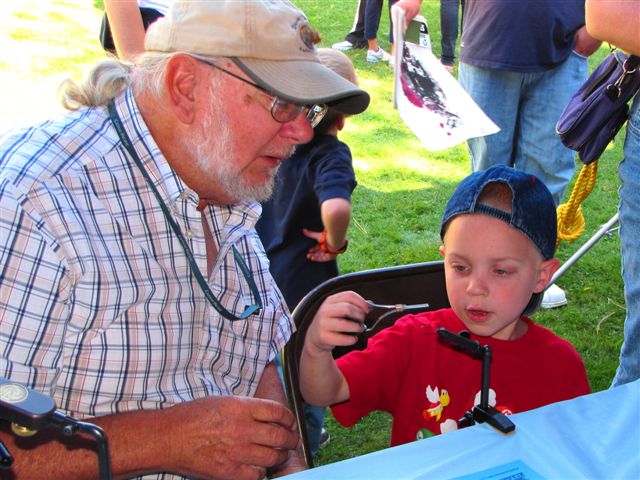 Tom Whiteside, of the Wenatchee Valley Fly Fishers assists a youngster in tying his first fly.