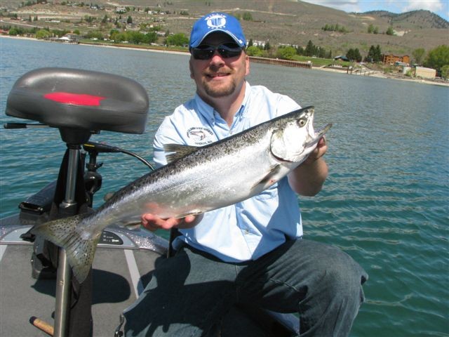 While fishing for smallmouth bass on Lake Chelan, Jerrod Gibbons, of Upper Columbia Guide Services, hooked and landed this Chinook salmon on a jerk bait!