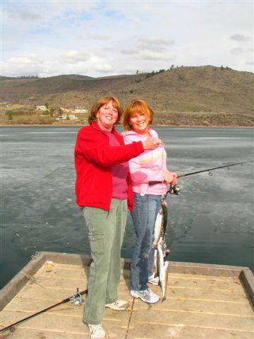 Donna Smith (left) of Port Orchard shows off a stringer of rainbow taken with her fishing partner Michele Clement of Tacoma at Roses Lake.