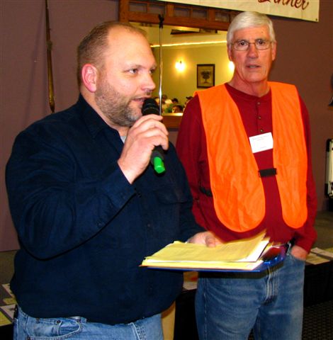 Eric Grandstrom (left) is doing his MC duties at the Annual Game Feed put on by the Wenatchee Sportsmen's Association. Gene Robard, chair of the event, looks on.