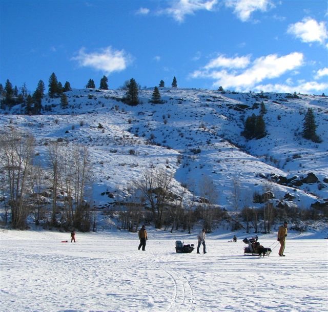 Anglers arrive at Patterson Lake for a day of ice fishing. Ice is about 18 inches thick and covers good numbers of trout and perch.