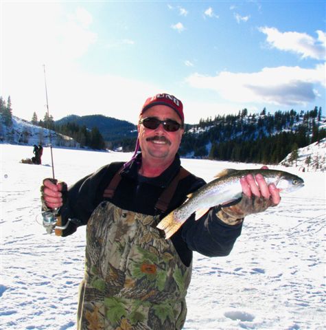 Dave Eichler of Wenatchee shows off a 17-inch rainbow he pulled through the ice at Patterson Lake, near Winthrop.