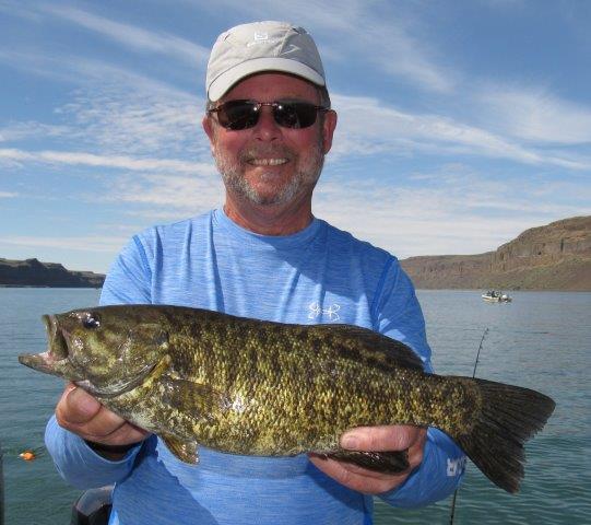 Tom Verschuren holds up a smallmouth bass that we caught while fishing for walleye on Banks Lake. It is not unusual to catch some nice smallmouth when trolling for walleye on this lake.
