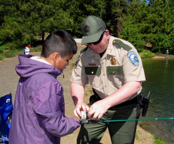 Department of Fish and Wildlife Chief of Enforcement Steve Bear helps a young angler catch a trout at the Free Fishing Weekend at Beehive Reservoir. Hundreds of anglers turned out for the free event.