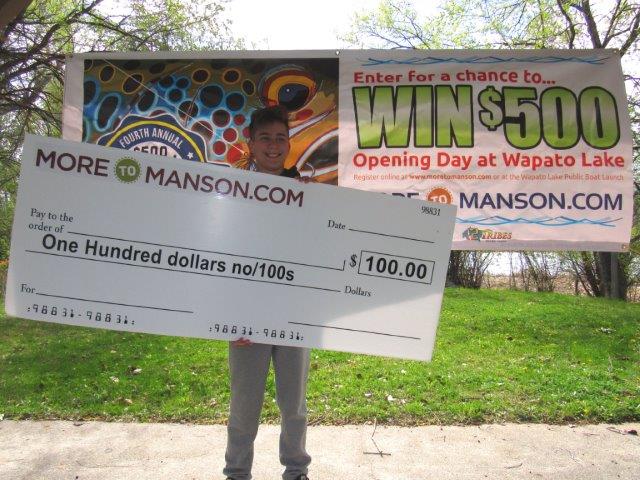Ben Collison holds up a check for $100.00 for winning the youth division at the Manson Trout Derby at Wapato Lake.