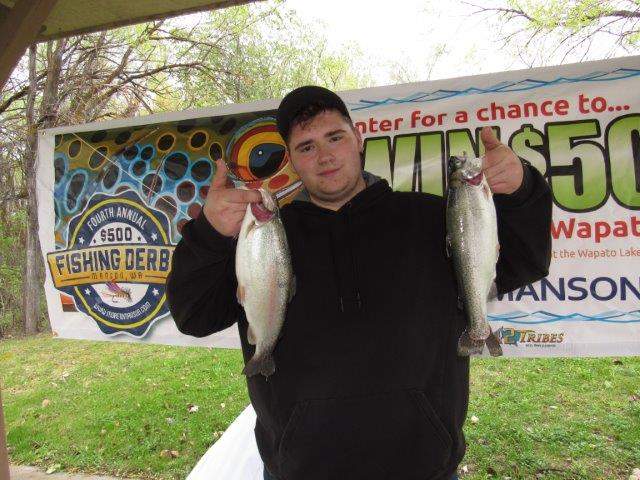 Colton Brooks holds up two of trout he turned in at the Manson Trout Derby at Wapato Lake. He won with a 2-pounder.