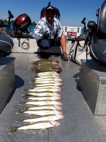 Austin Moser, of Austins Northwest Adventures, poses with the 24 walleye taken on Moses Lake on side planers and cranks.
