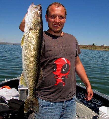 Justin Dunagan shows off one of the walleye he landed while fishing with Austin Moser on on a crank bait on Moses Lake.