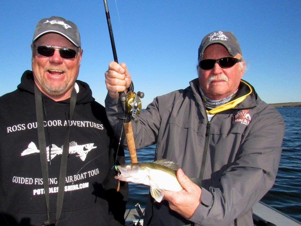 Shelby Ross (left) and Brian Nielson, both guides on Potholes, with one of the walleye that was landed on our trip in April.