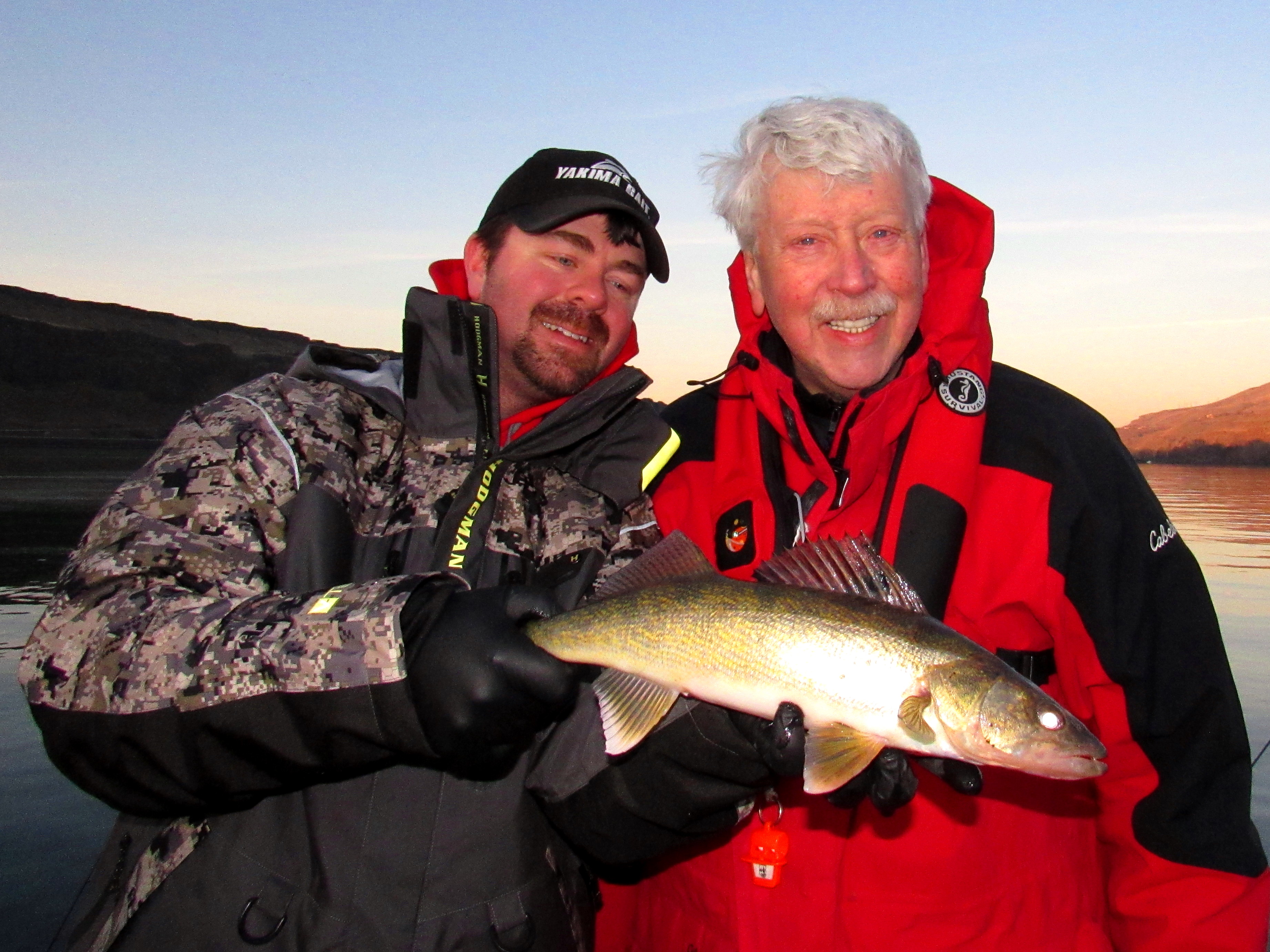 Shane and Bob Hall celebrate landing a nice walleye near Biggs on the Columbia River.