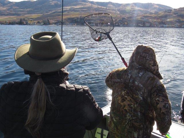 Dennis Broughton lifts his rod and Jim Passage lifts the net under a nice kokanee at Lake Chelan. Team work!