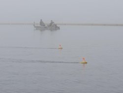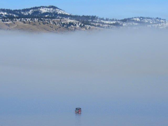 The fog was so thick on our last trip to Lake Roosevelt we could barely see this boat trolling at the can line.
