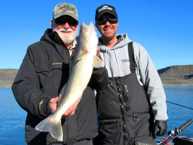 Bob Kiepki from Pateros shows off a nice Banks Lake walleye with Shane Magnuson. Water temps were chilly just after ice-off.
