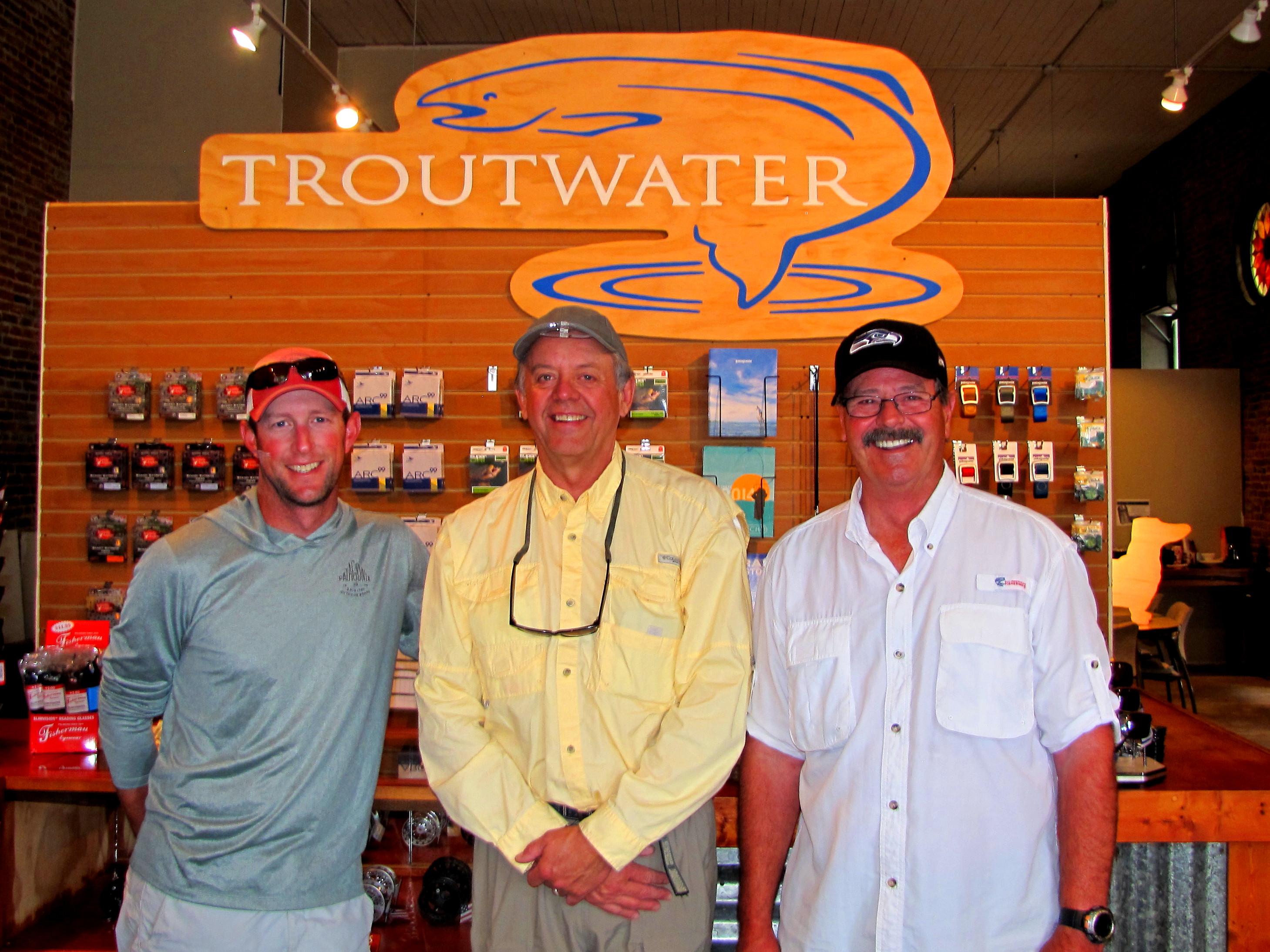 Before heading for the Yakima River I had our party pose for a photo. Here is guide Johnny Boitano (l), Washington Fish and Wildlife Director Jim Unsworth, and myself in the Troutwater Fly Shop in Ellensburg.