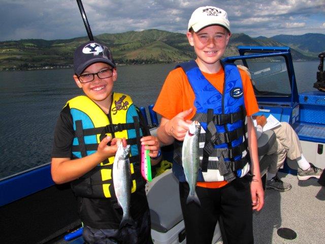 Josh Anatatmula (l) and his cousin Ethan Sears teamed up to landed 17 kokanee on the Lake Chelan on a trip with me recently. They are showing their fish and one of the Kokabow Fishing Tackle blades that did the trick for them.