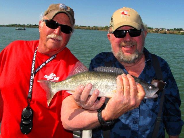 Brian Nielson, BJs Guide Service, helps Lenny Readick, of Butte, Montana, show off one of the nice walleye he caught on a recent trip to Moses Lake. Walleye are abundant and big this year.