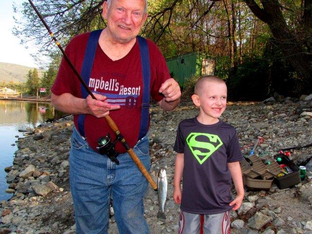 Kip Broughton poses with Gabriel Sheaneman who just caught the first fish of his life. He was fishing the Chelan River near the bridge.
