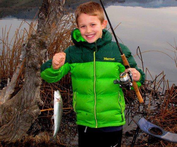 Nine-year-old Wyatt Pevny of Marysville landed this rainbow at Roses Lake. There were are few anglers on the ice free lake when I stopped by.