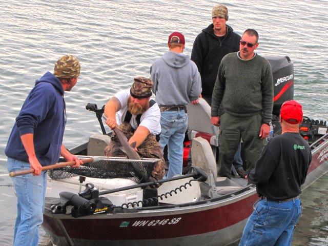 Here you see a boat delivering a live fall Chinook to Washington Department of Fish and Wildlife staff on shore at White Bluffs. They were carried to a tanker truck for delivery to the Grant County PUD hatchery. Over 300 fish were caught and delivered live to the hatchery to boost natural origin spawning.