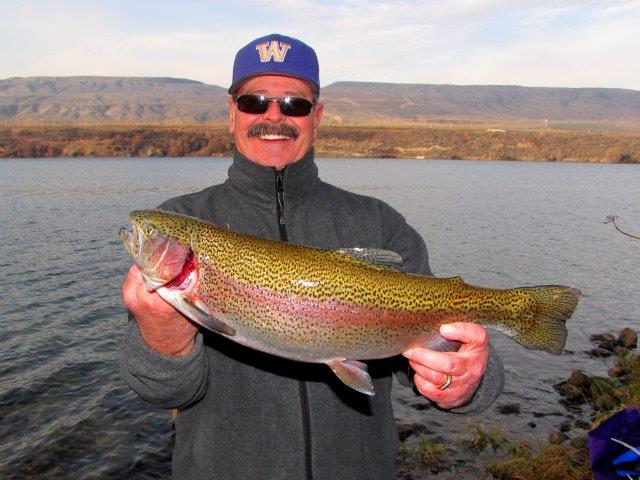 I got this nice rainbow at Rufus Woods Reservoir recently. Eric Granstrom and I landed three other smaller fish before I got this one. There are still some good triploids being landed off Brandts Landing.