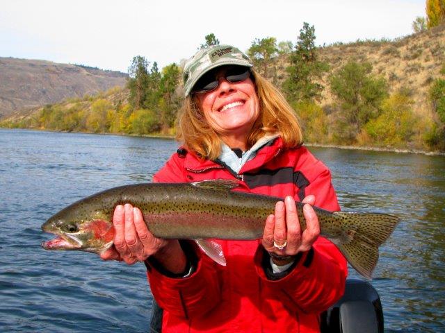 My wife Eileen is pretty pleased with her first steelhead of the season. This one was landed on our favorite stretch of the Columbia below Chief Joseph Dam. We were fishing with bobbers and jigs baited with shrimp.