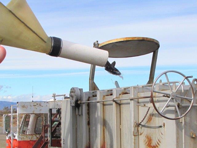A fall Chinook leaves a conveyor and enters a tank truck for transfer from the holding pond to the just completed Grant County PUD hatchery at Priest Rapids. The new state of the art facility will release