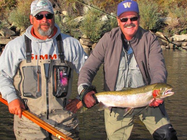 Rollie Schmitten (right) celebrates catching his second marked steelhead on the Methow River. Guide Jeff Brazda put us on fish all day long. We were fishing with nymphs under indicators.