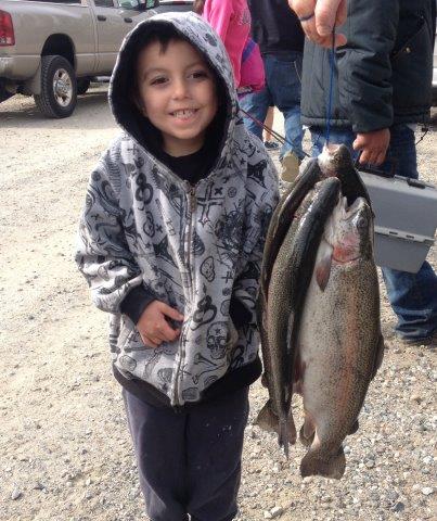 The Carinito family traveled from Kent, the Dix family from Spokane and they met at Deep Lake where their kids collected this fine catch of rainbow.