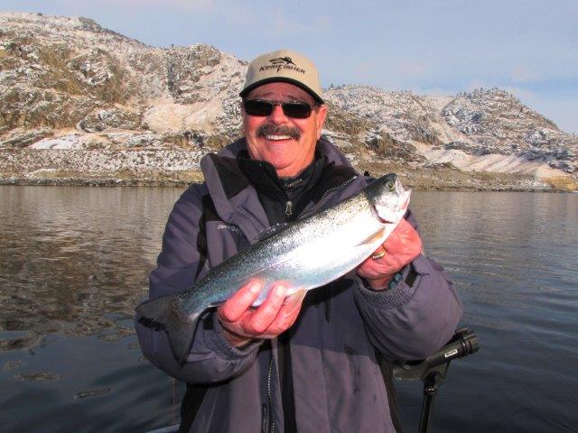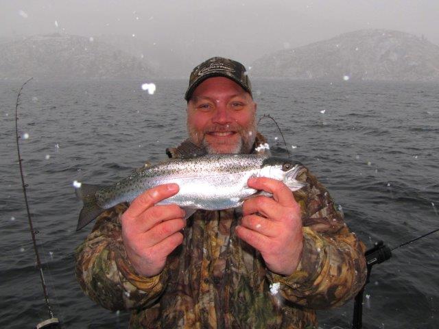 Eric Granstrom shows off one of the rainbow we caught in the middle of a snow storm on Lake Roosevelt. This one hit an orange Rapala fished off a side planer. We caught others on downriggers.