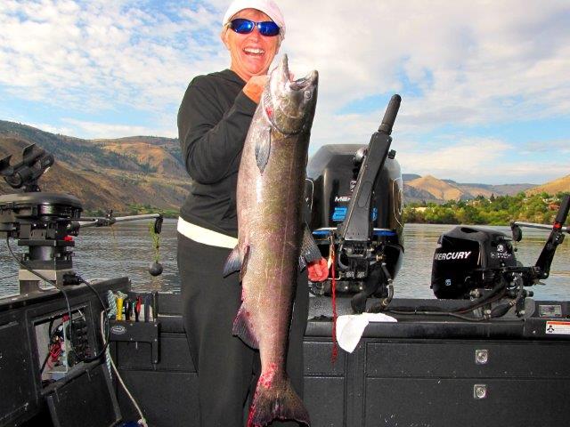 Connie Monson, is just five feet two and it was all she could do to hold up this king she caught at Chelan Falls.
