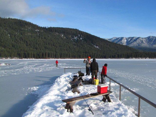 These anglers chose to fish from the dock at Fish Lake, rather than walk through the layer of slush. Warm weather creates this condition, but there is 5 inches of ice under the slush on the main lake.