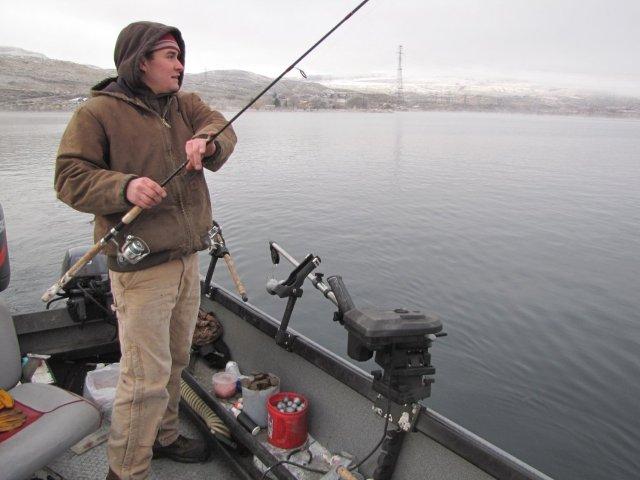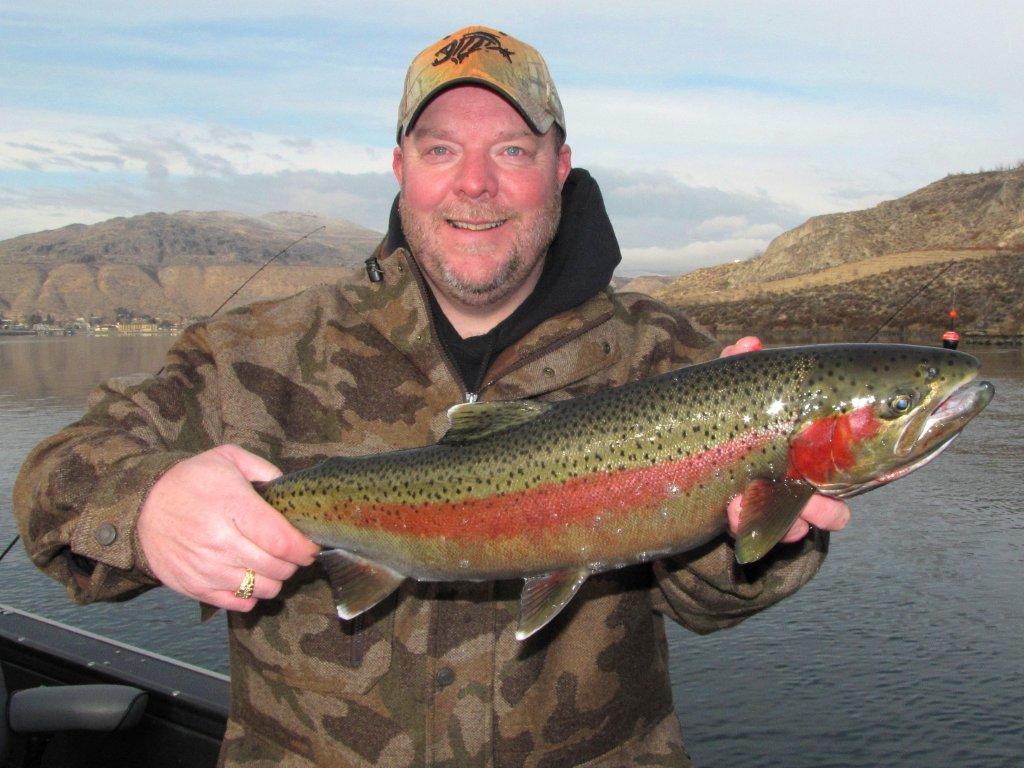 Jason Gutzweiler shows of one of many triploids caught on a recent trip to Rufus Woods Reservoir. This fish was one of the bigger ones caught that day, which was the coldest day of the year on Rufus Woods so far this season. We were fishing with Stuart Hurd of Hurd's Guide Service.