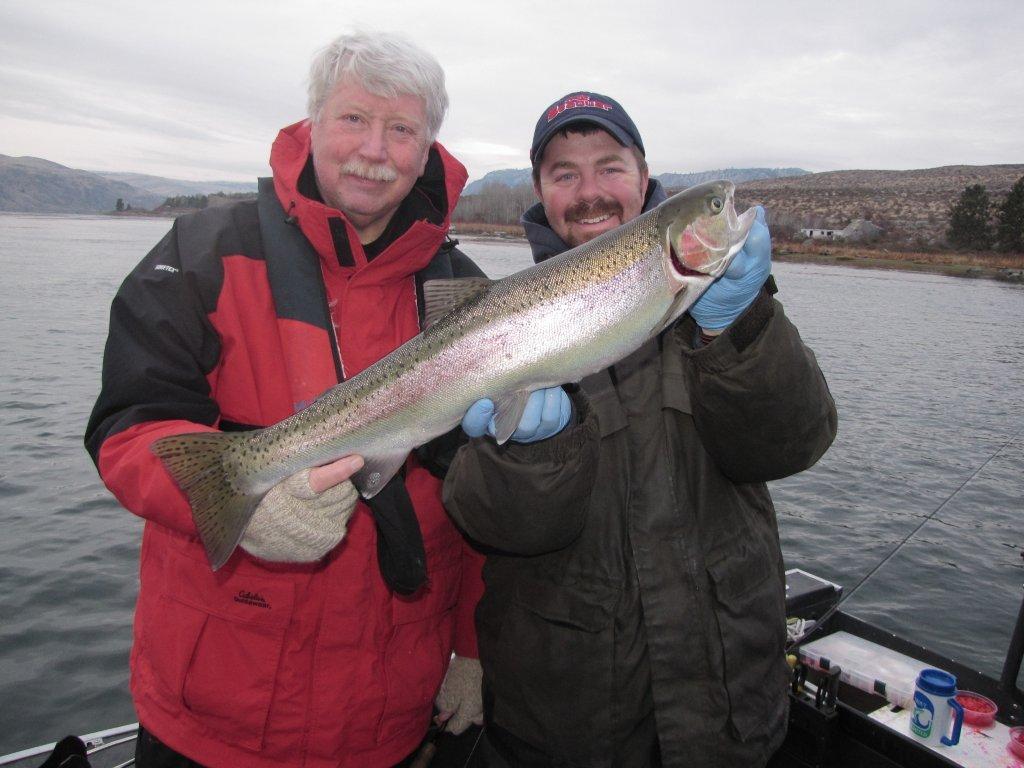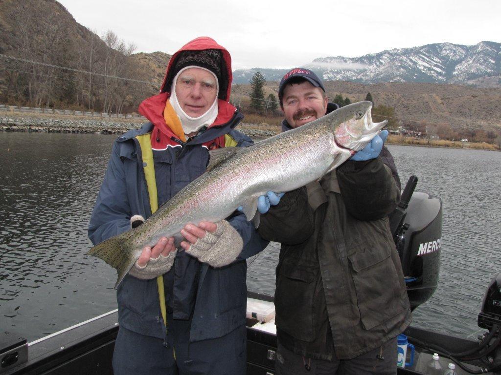 Pete Fiones of Gig Harbor poses with Shane Magnuson, Upper Columbia Guide Service, with one of many steelhead he caught near Pateros recently. This one was a keeper and he got another to get his limit. The keepers caught that day ranged in size from 6 to 10 pounds.