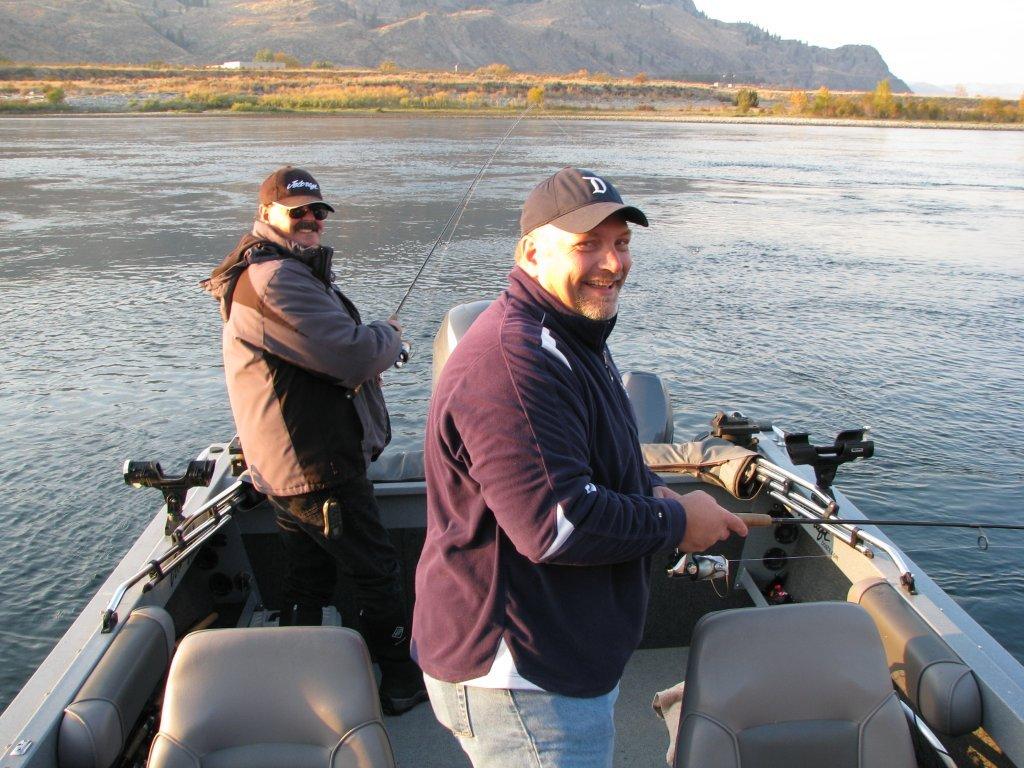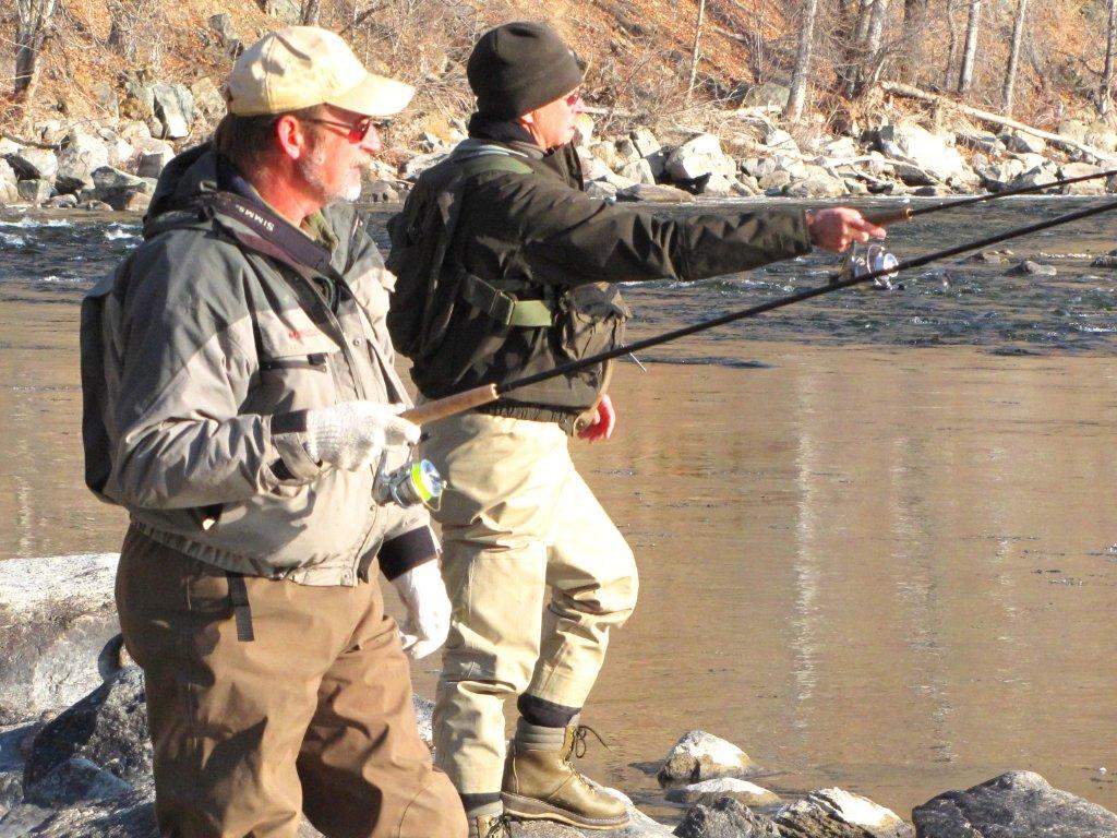 Keith Roe, left, shows Rollie Schmitten how to approach a hole on the Methow River. At the next hole Roe took three fish on his jigs, including a Coho salmon and two wild steelhead.